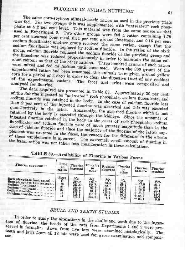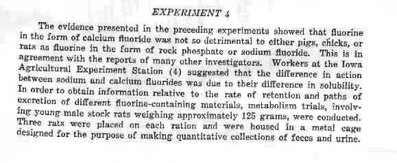 In 1946 Samuel Chase, one of the authors of the above study, became president of the International Association for Dental Research (IADR). This organization promoted the idea that only the “fluoride ion” in the various fluoridation compounds was of importance. Yet he well knew that other fluorides did not behave like calcium fluoride - the “natural fluoride”, as can be seen in the above table. Unlike calcium fluoride, sodium fluoride was retained in great amounts in the body and was very toxic - as all findings indicated. Rock phosphate and sodium fluosilicate experiments yielded the same information.